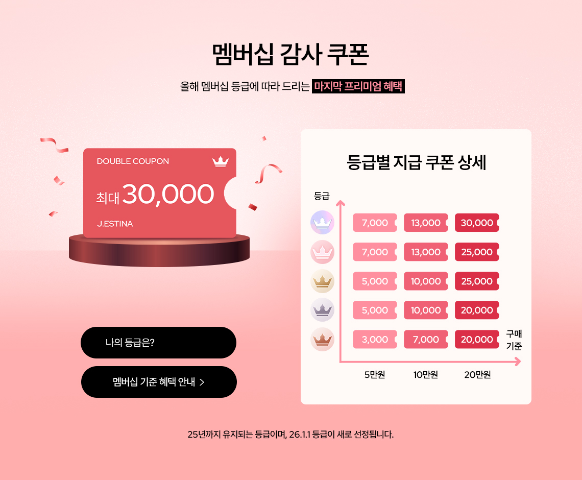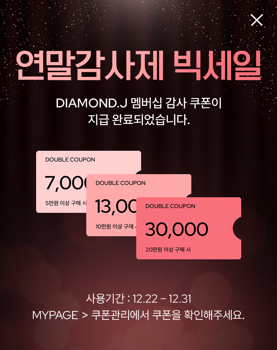 본 더블 쿠폰은 등급에 맞게 지급되며, 쿠폰 다운로드를 누른 고객에 한 해 지급됩니다.