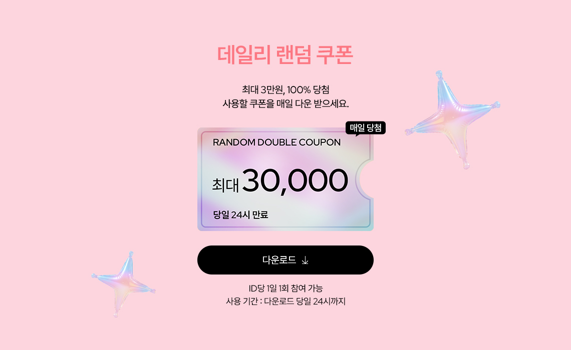 본 랜덤 할인은 다운로드를 누른 고객에 한 해 랜덤으로 최대 3만원 더블쿠폰이 지급 되며, 마이페이지 쿠폰관리에서 확인 가능합니다.