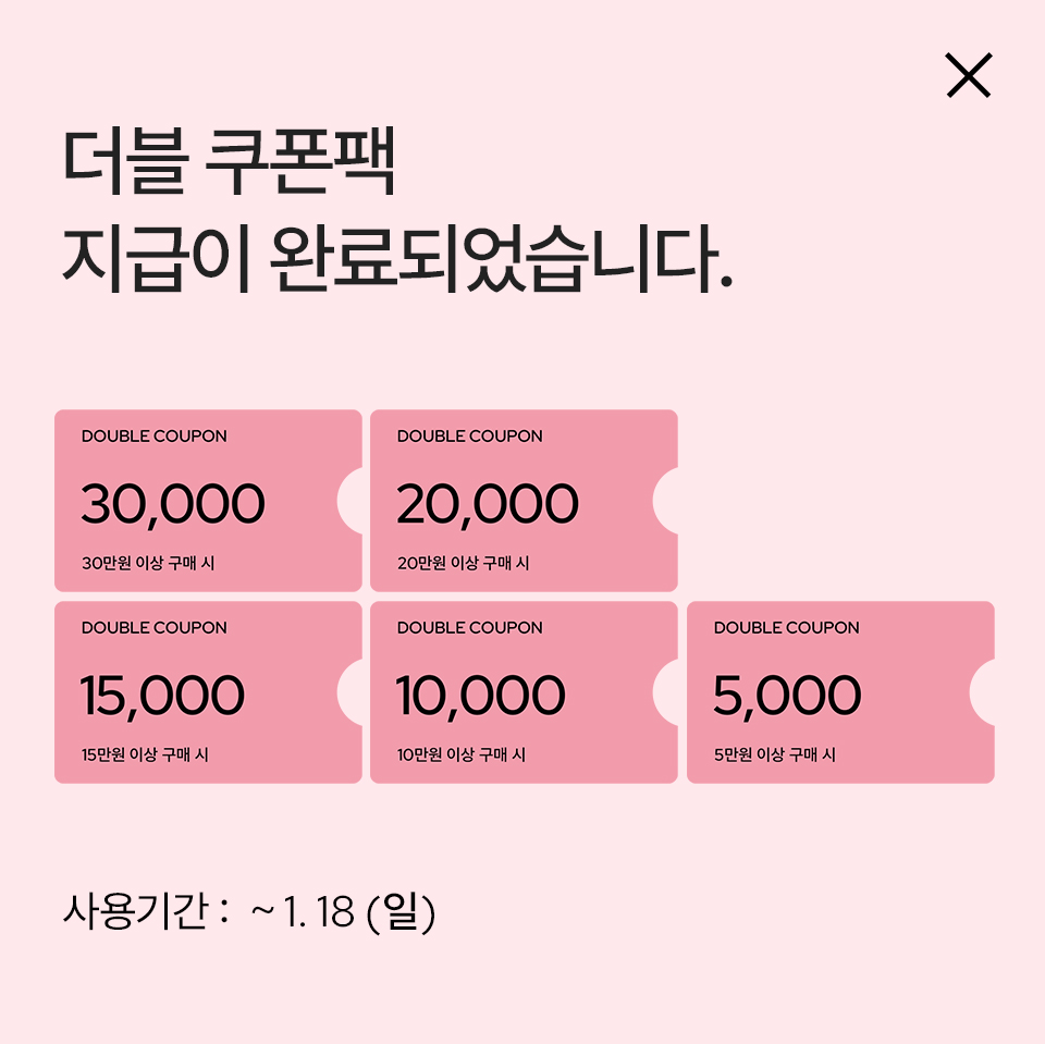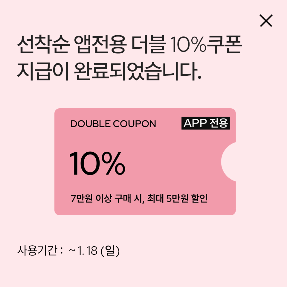 본 쿠폰은 1. 18 (일)까지 사용 가능하며, ID당 1회 다운로드 가능하며, 일부 상품의 경우 쿠폰 적용이 불가 할 수 있습니다.
