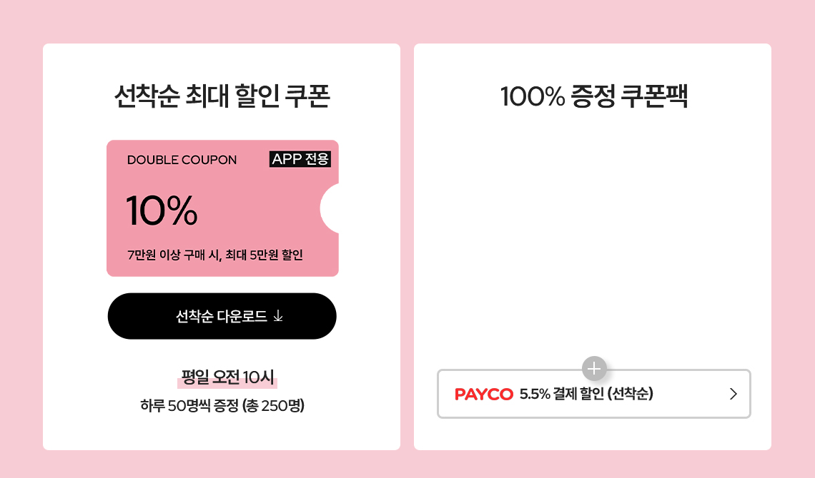본 쿠폰은 평일 오전 10시마다 쿠폰 다운로드를 누른 고객에 한 해 각 선착순 50명씩 총 250명에게 지급 되며, 마이페이지 쿠폰관리에서 확인 가능합니다.