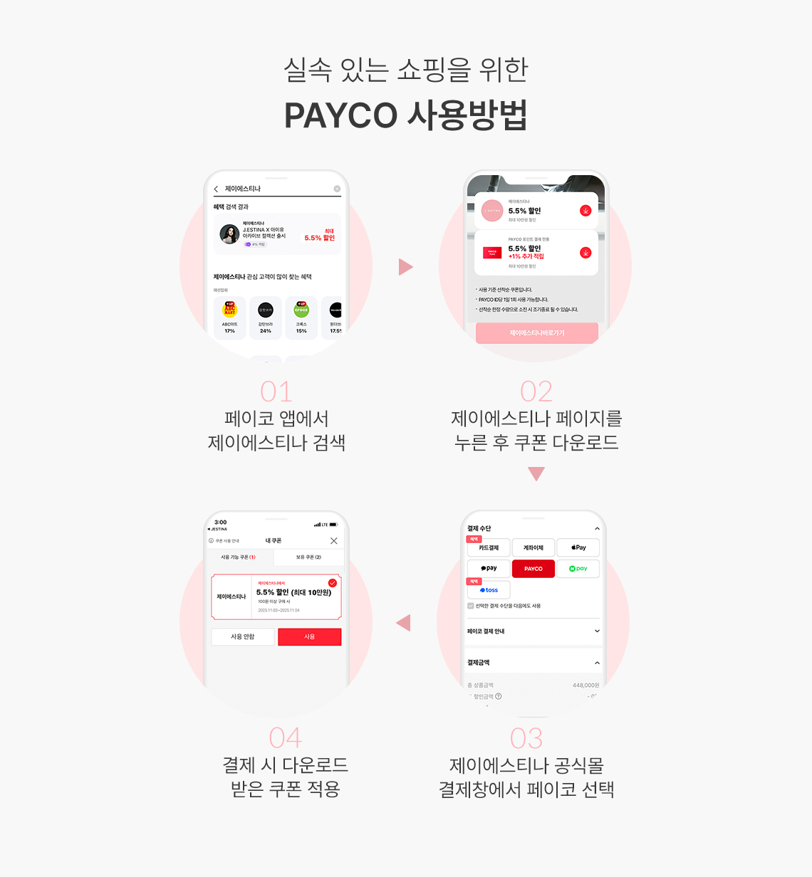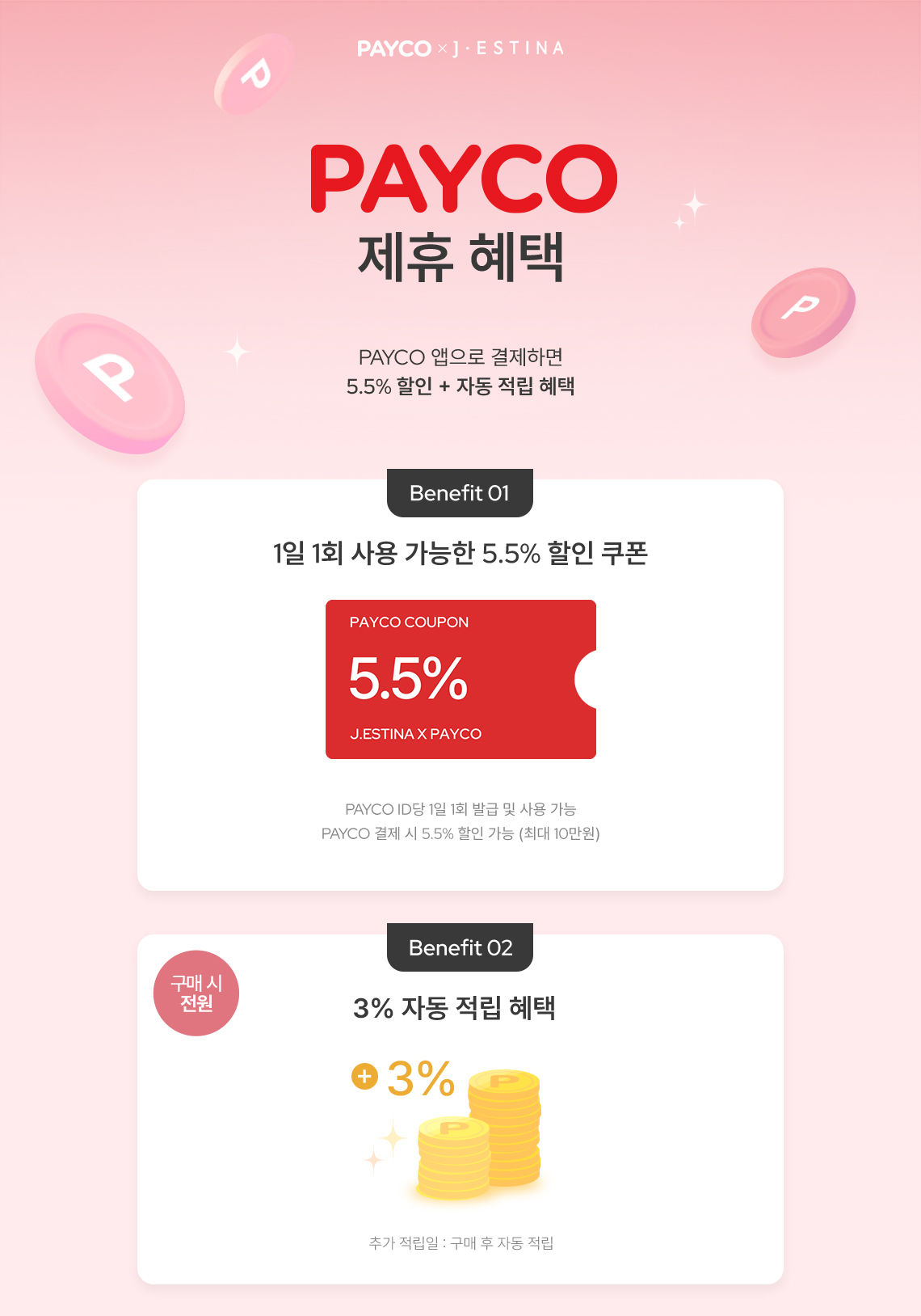 본 쿠폰은 PAYCO 앱 내 제이에스티나 페이지에서 발급 및 확인 가능합니다. 자세한 다운로드 방법은 이벤트 페이지 하단의 PAYCO 사용방법을 확인해 주세요.